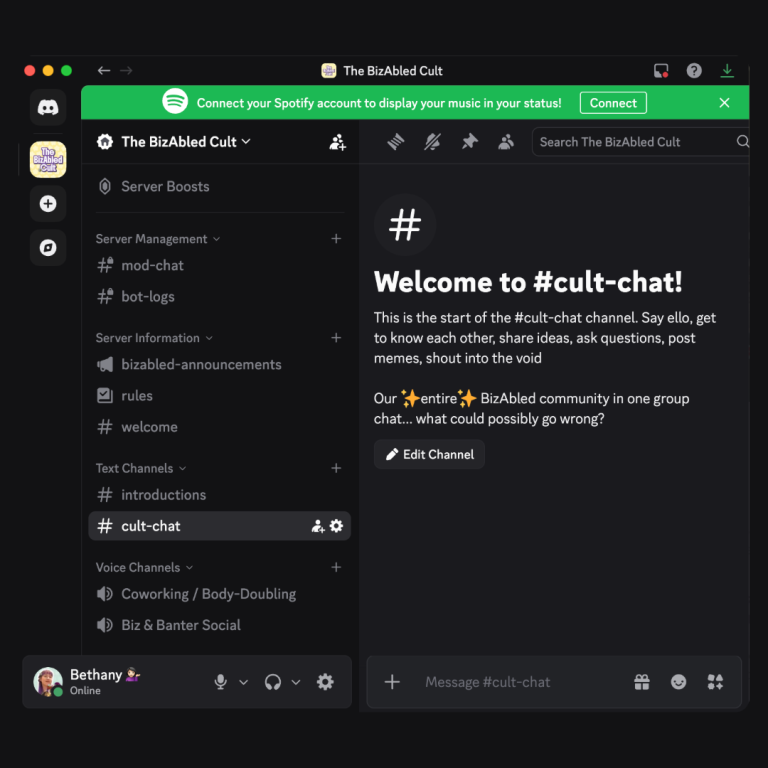 The BizAbled Cult is a low-pressure, drop-in community for neurodivergent, chronically ill, disabled & LGBTQIA+ business owners who want connection, support, and a place to exist without having to perform for it